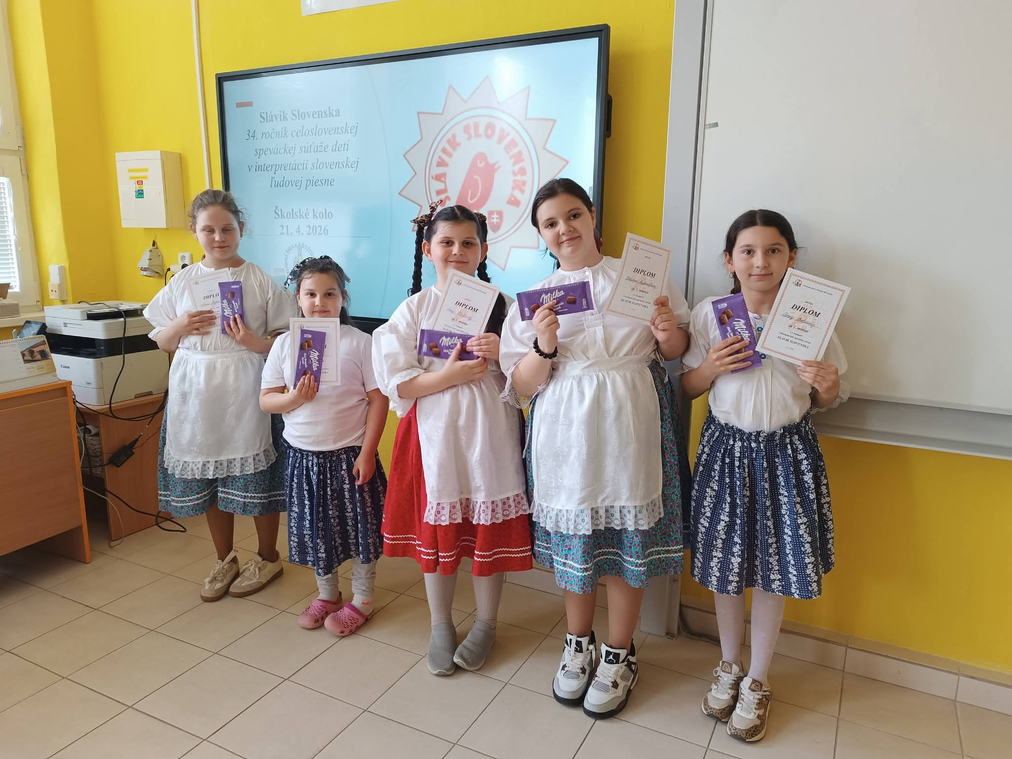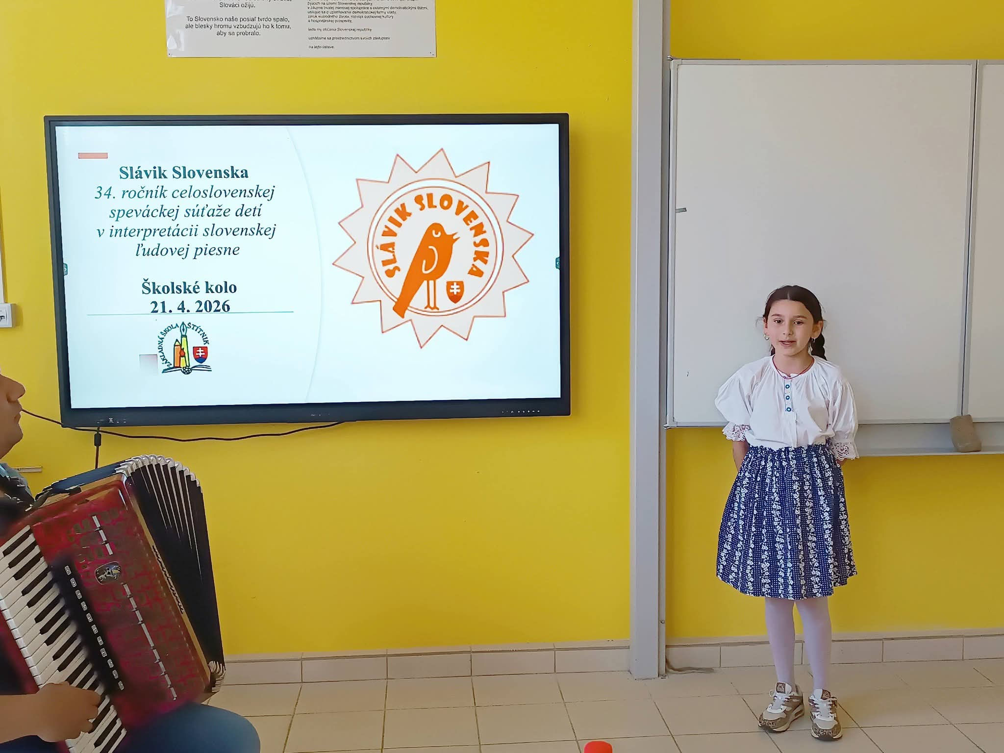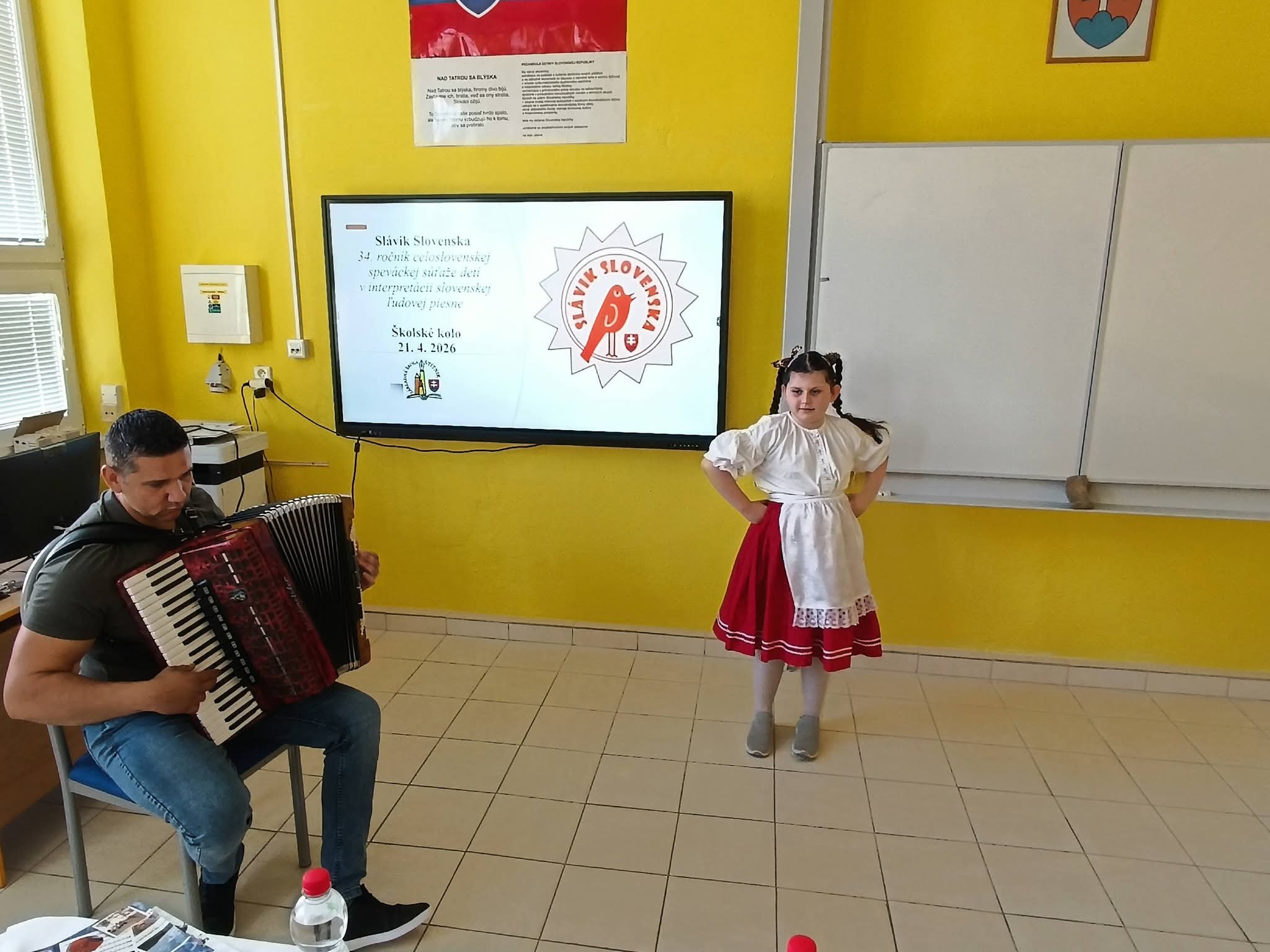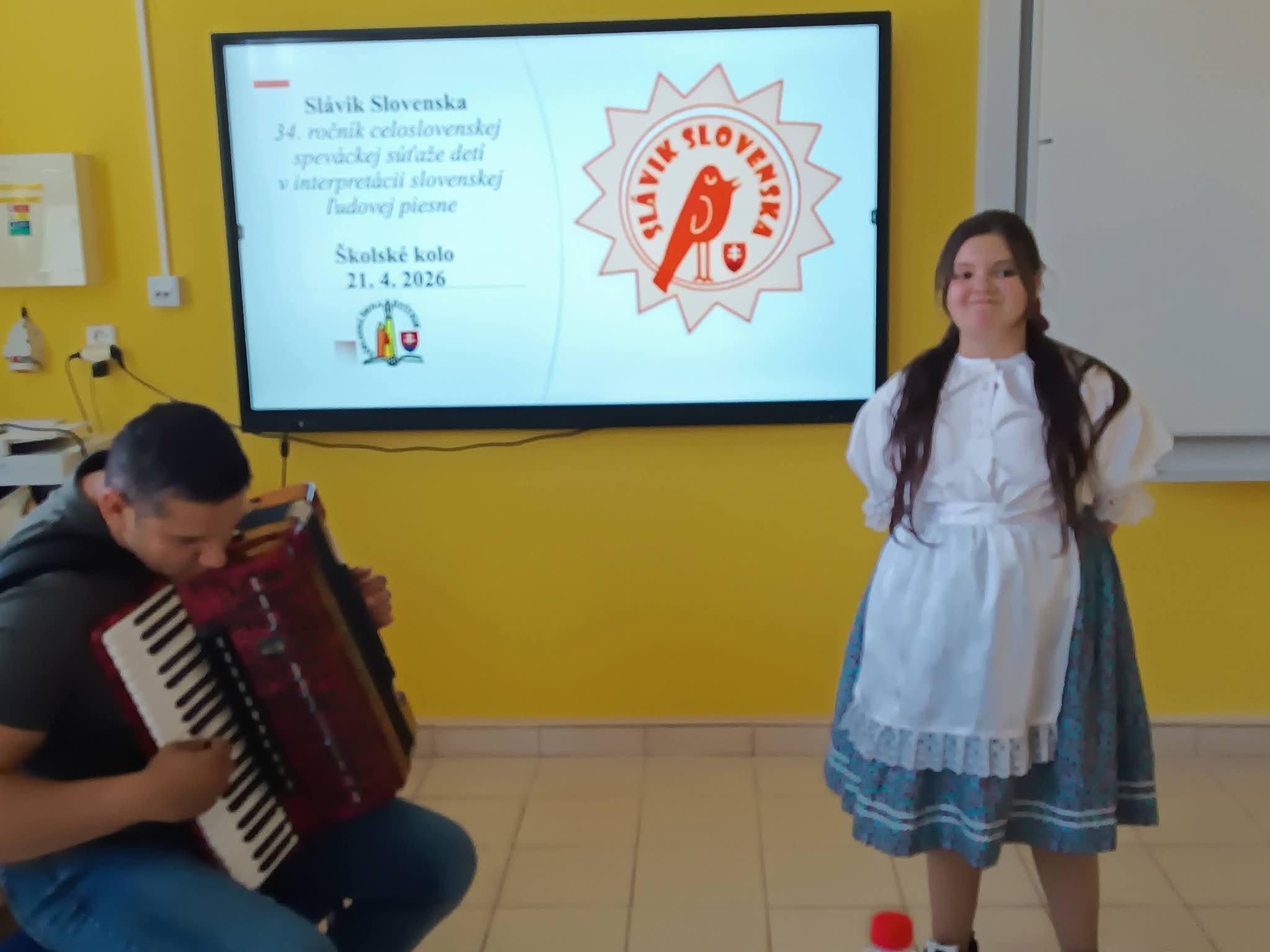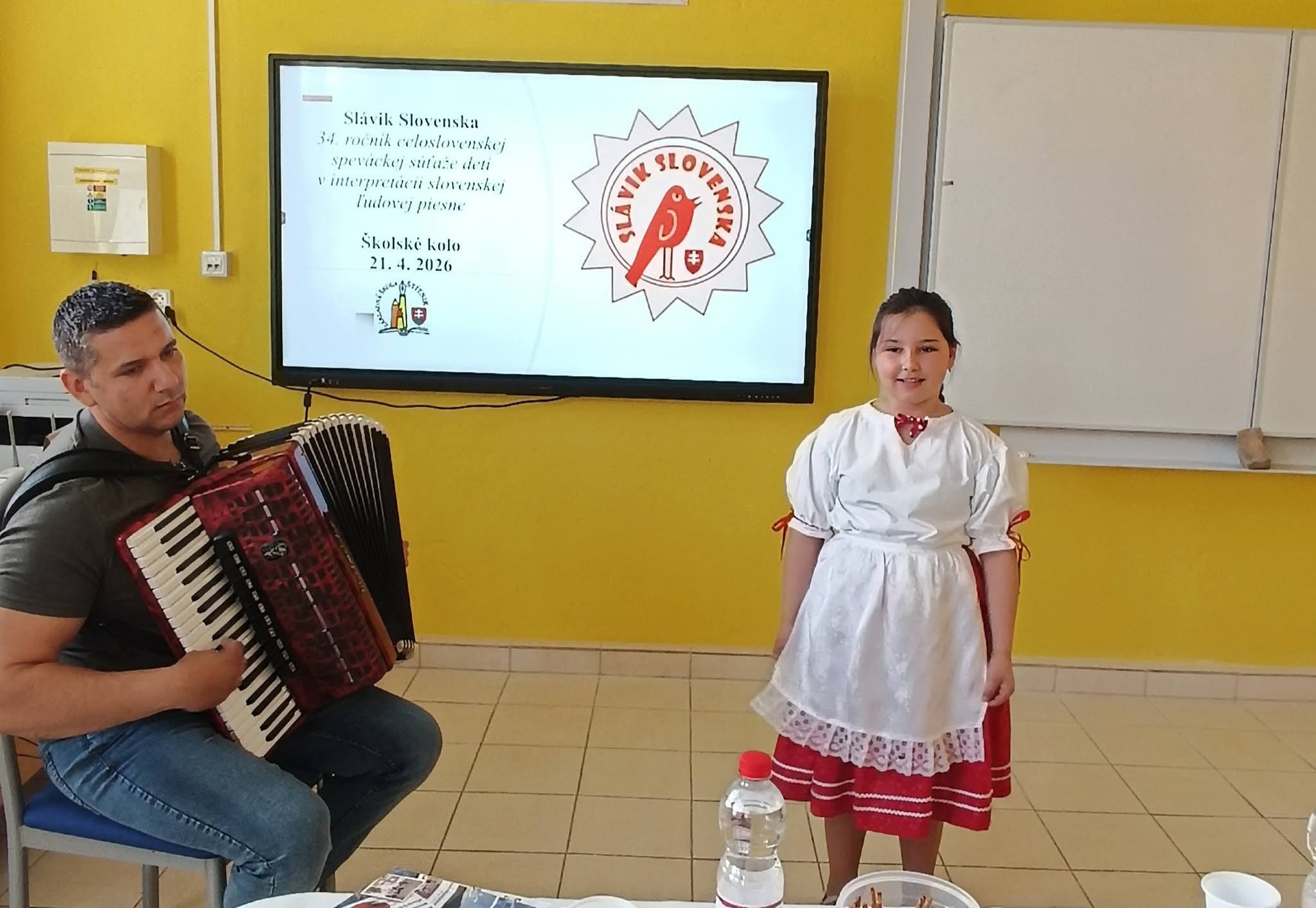 21.4.2026 sa naši žiaci zmenili na mladých slávikov a rozozvučali učebňu folklórnymi tónmi v školskom kole speváckej súťaže Slávik Slovenska. V porote sme mali vzácnu návštevu, bývalú pani riaditeľku Jarmilu Motúzovú. Na harmonike žiakov hudobne sprevádzal Ivan Hlaváč. Na každého žiaka čakala sladká odmena.