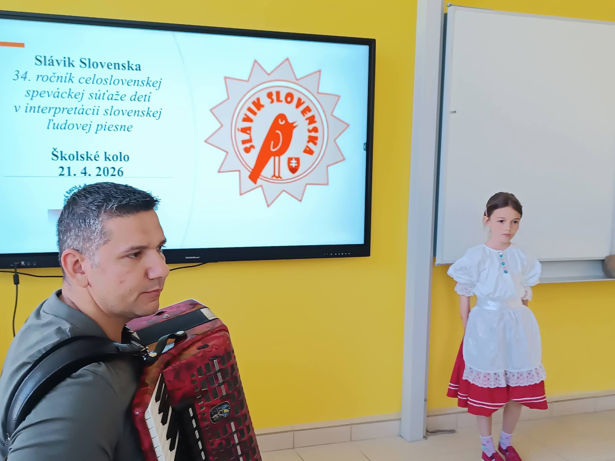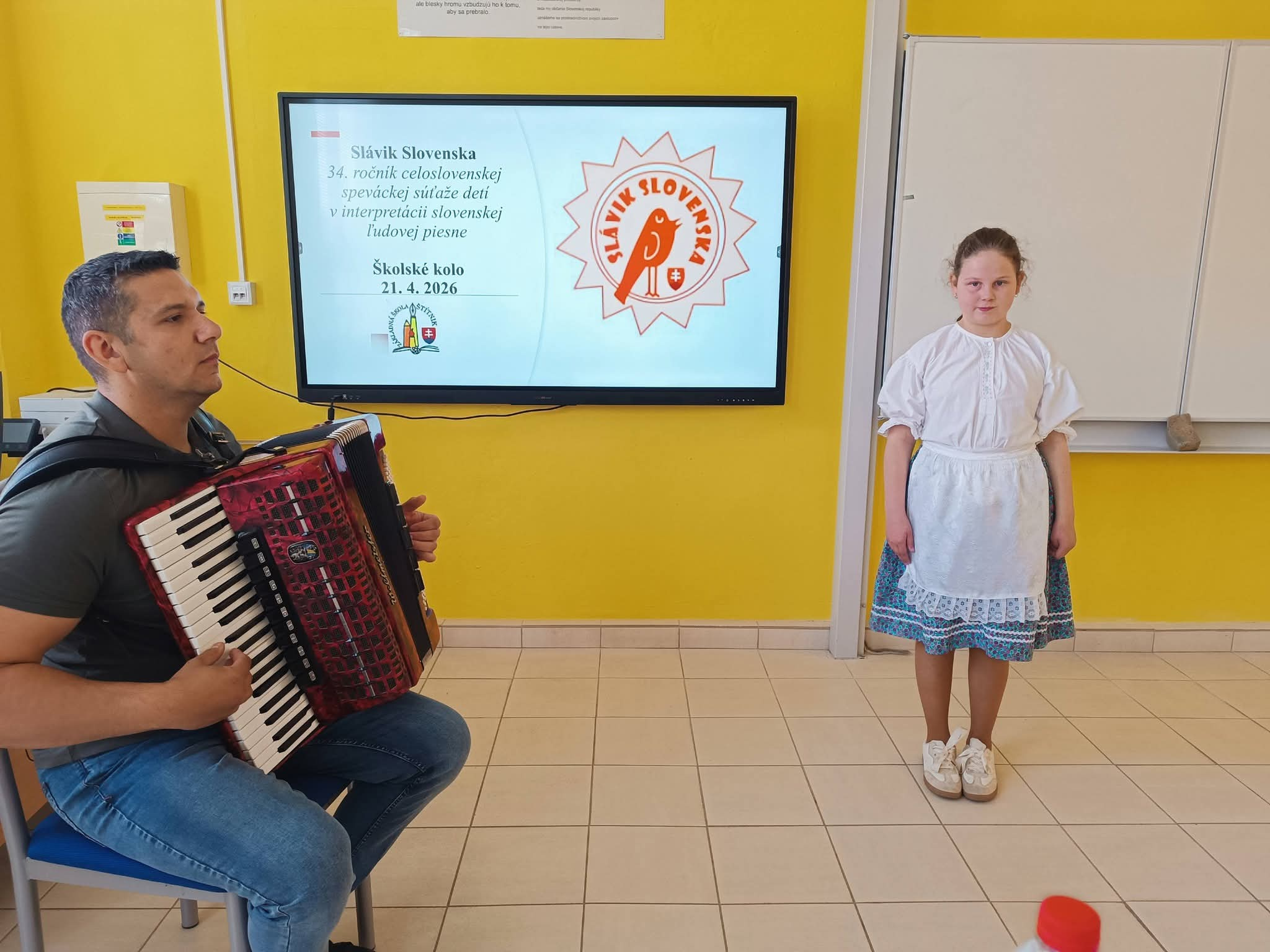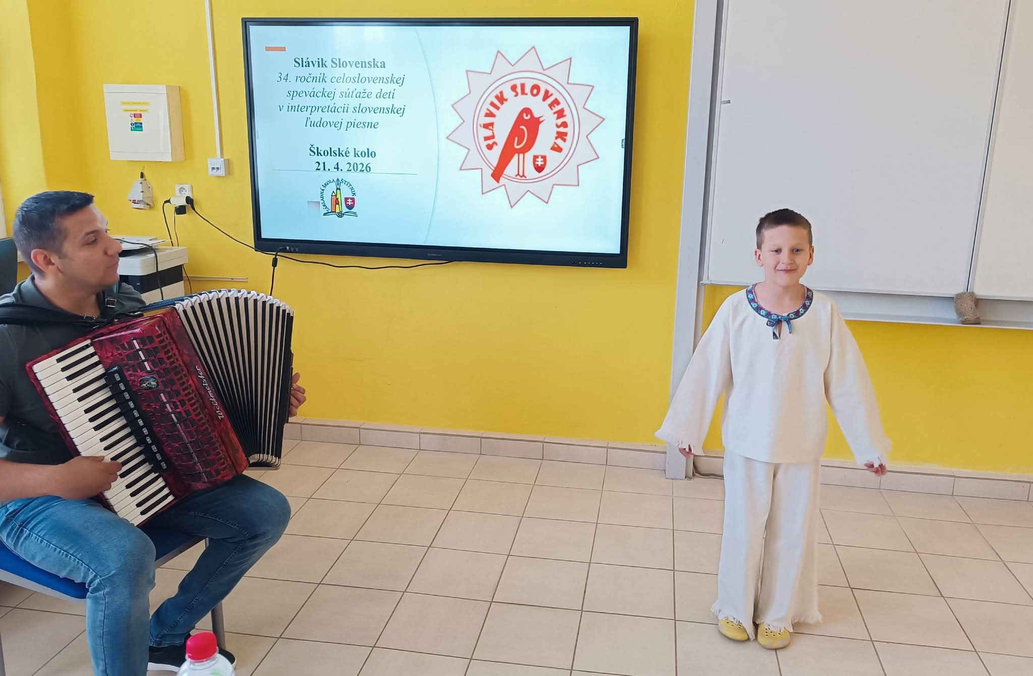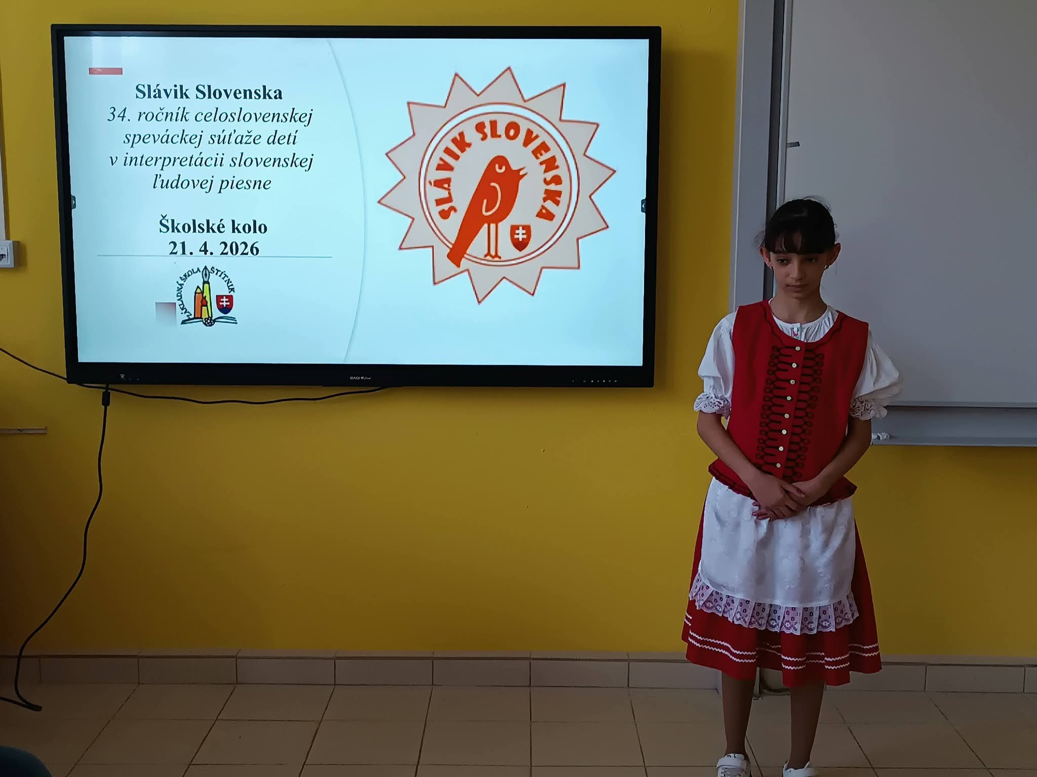 21.4.2026 sa naši žiaci zmenili na mladých slávikov a rozozvučali učebňu folklórnymi tónmi v školskom kole speváckej súťaže Slávik Slovenska. V porote sme mali vzácnu návštevu, bývalú pani riaditeľku Jarmilu Motúzovú. Na harmonike žiakov hudobne sprevádzal Ivan Hlaváč. Na každého žiaka čakala sladká odmena.