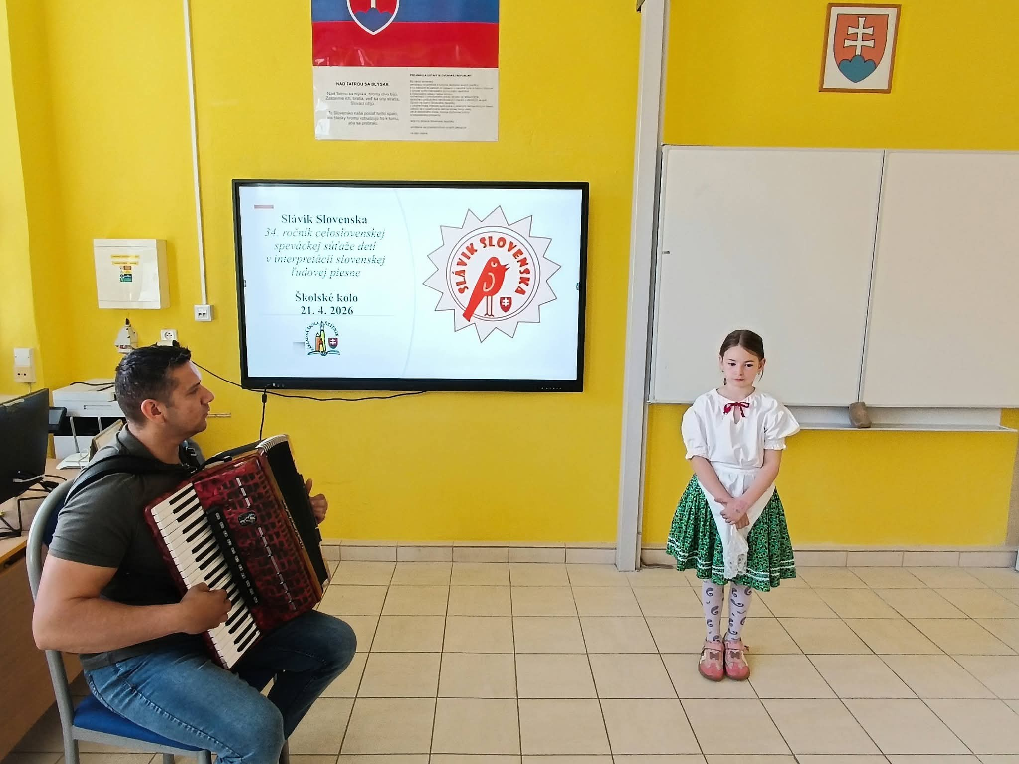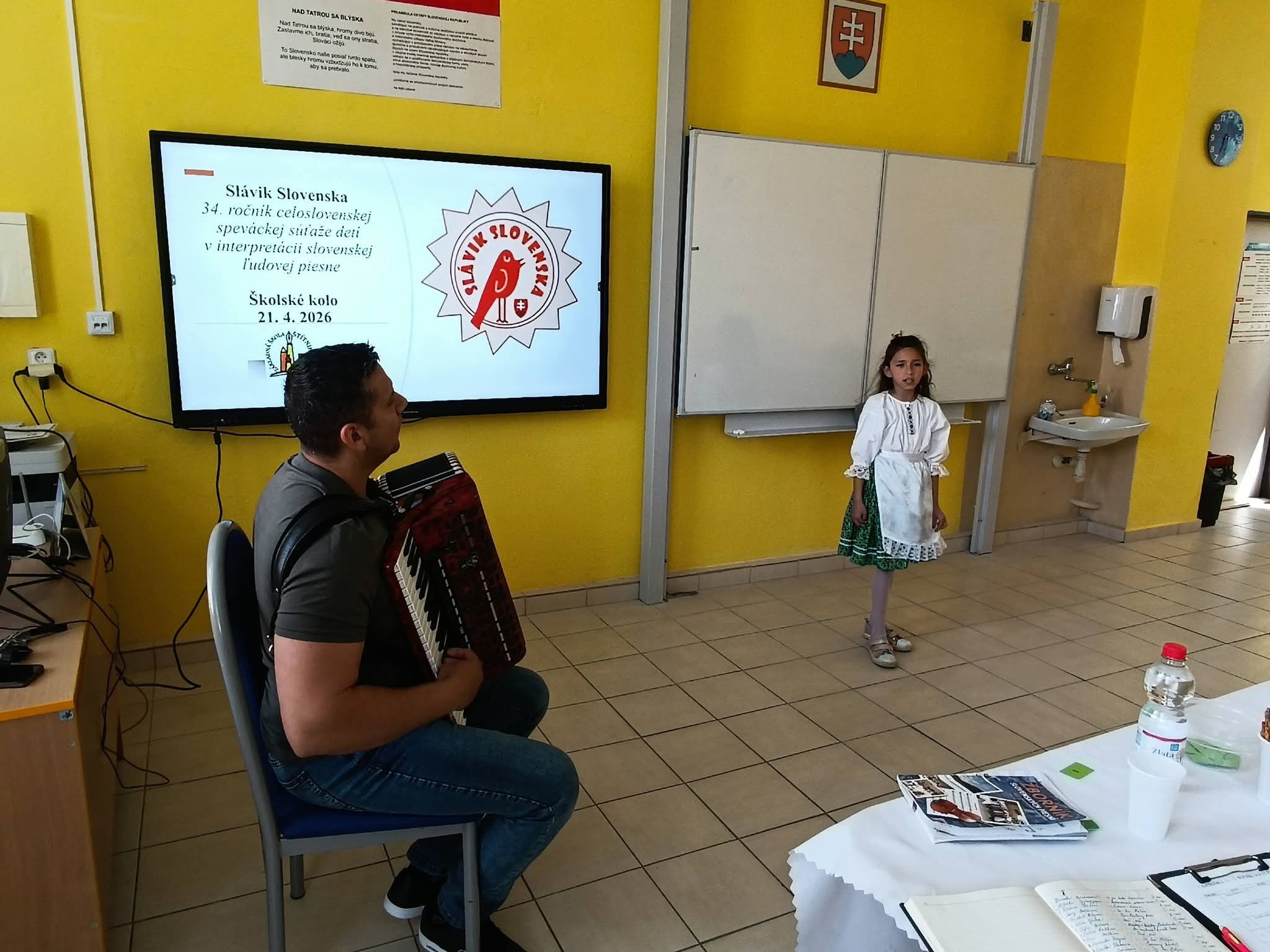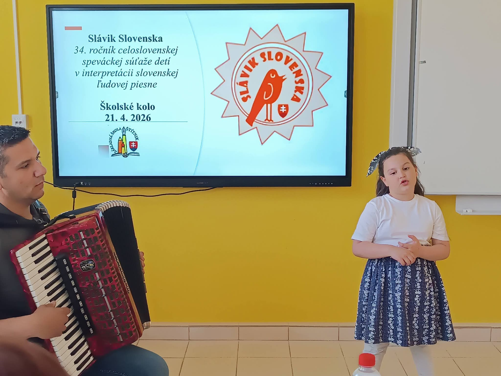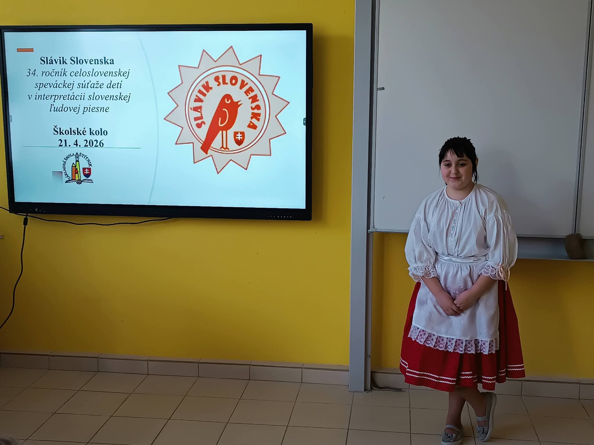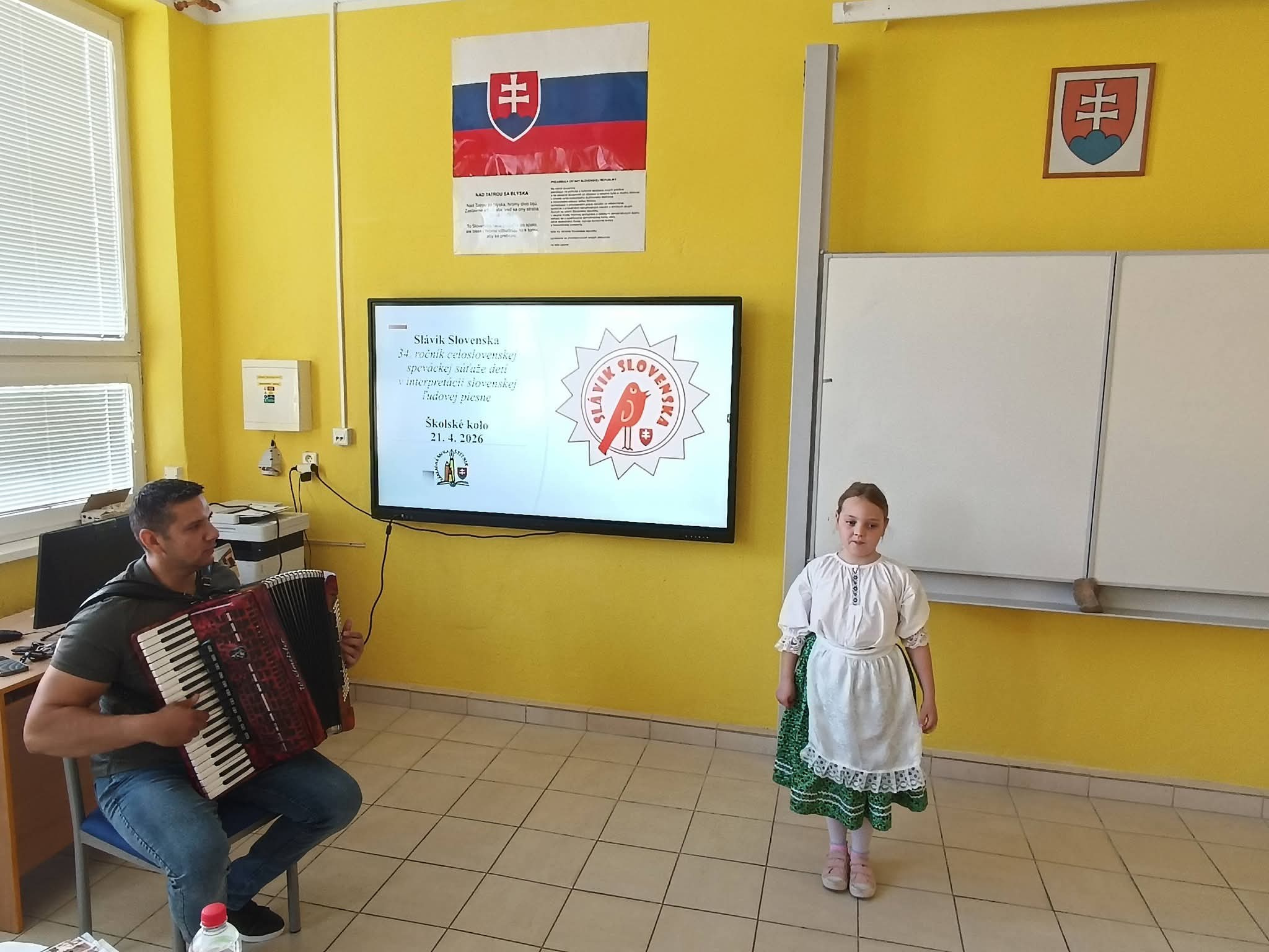 21.4.2026 sa naši žiaci zmenili na mladých slávikov a rozozvučali učebňu folklórnymi tónmi v školskom kole speváckej súťaže Slávik Slovenska. V porote sme mali vzácnu návštevu, bývalú pani riaditeľku Jarmilu Motúzovú. Na harmonike žiakov hudobne sprevádzal Ivan Hlaváč. Na každého žiaka čakala sladká odmena.