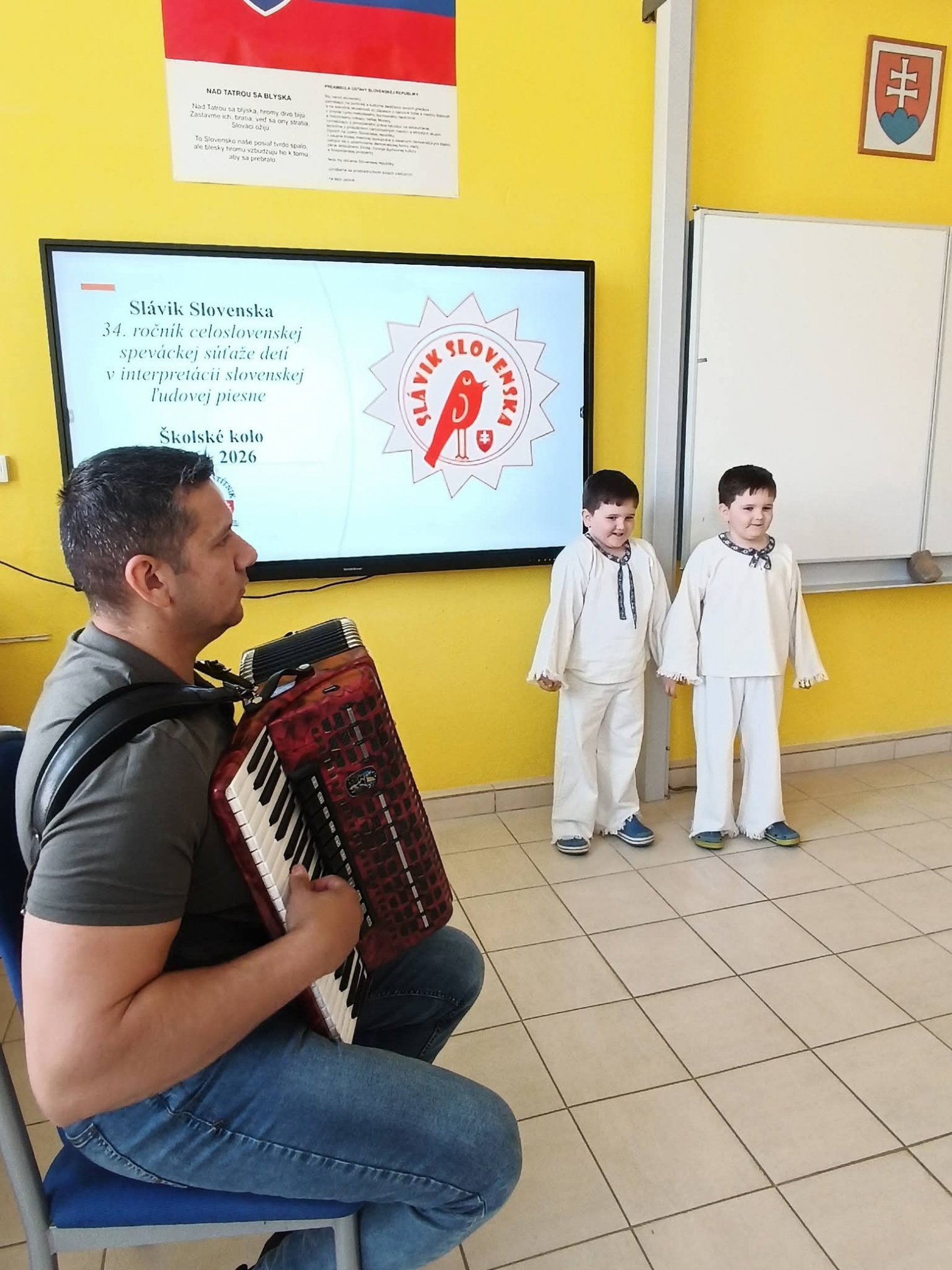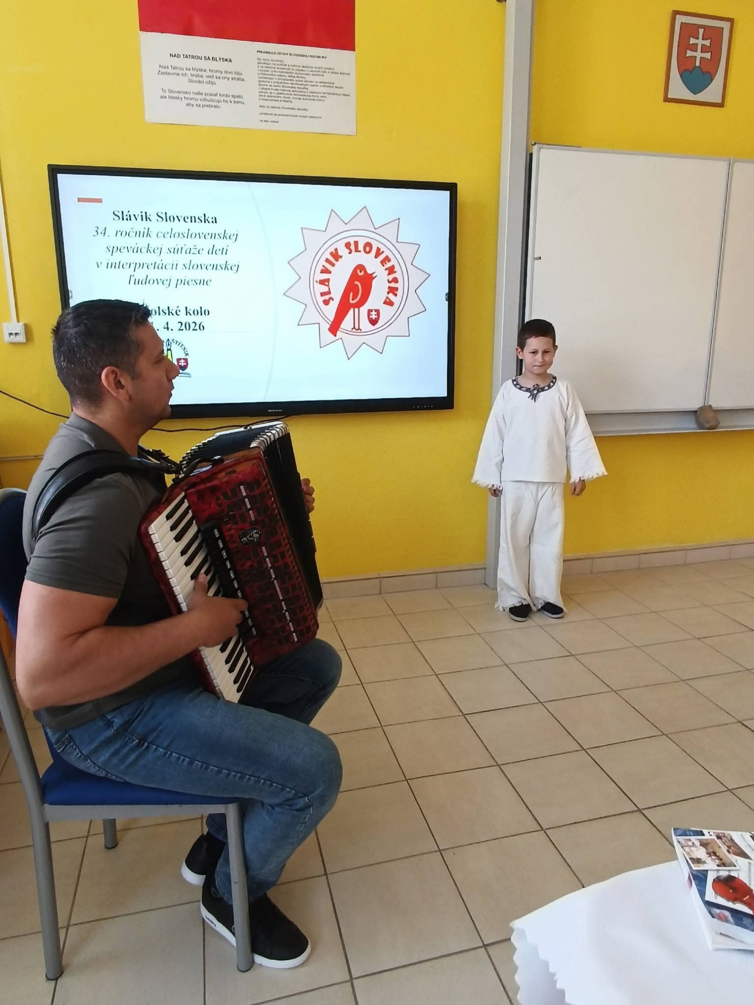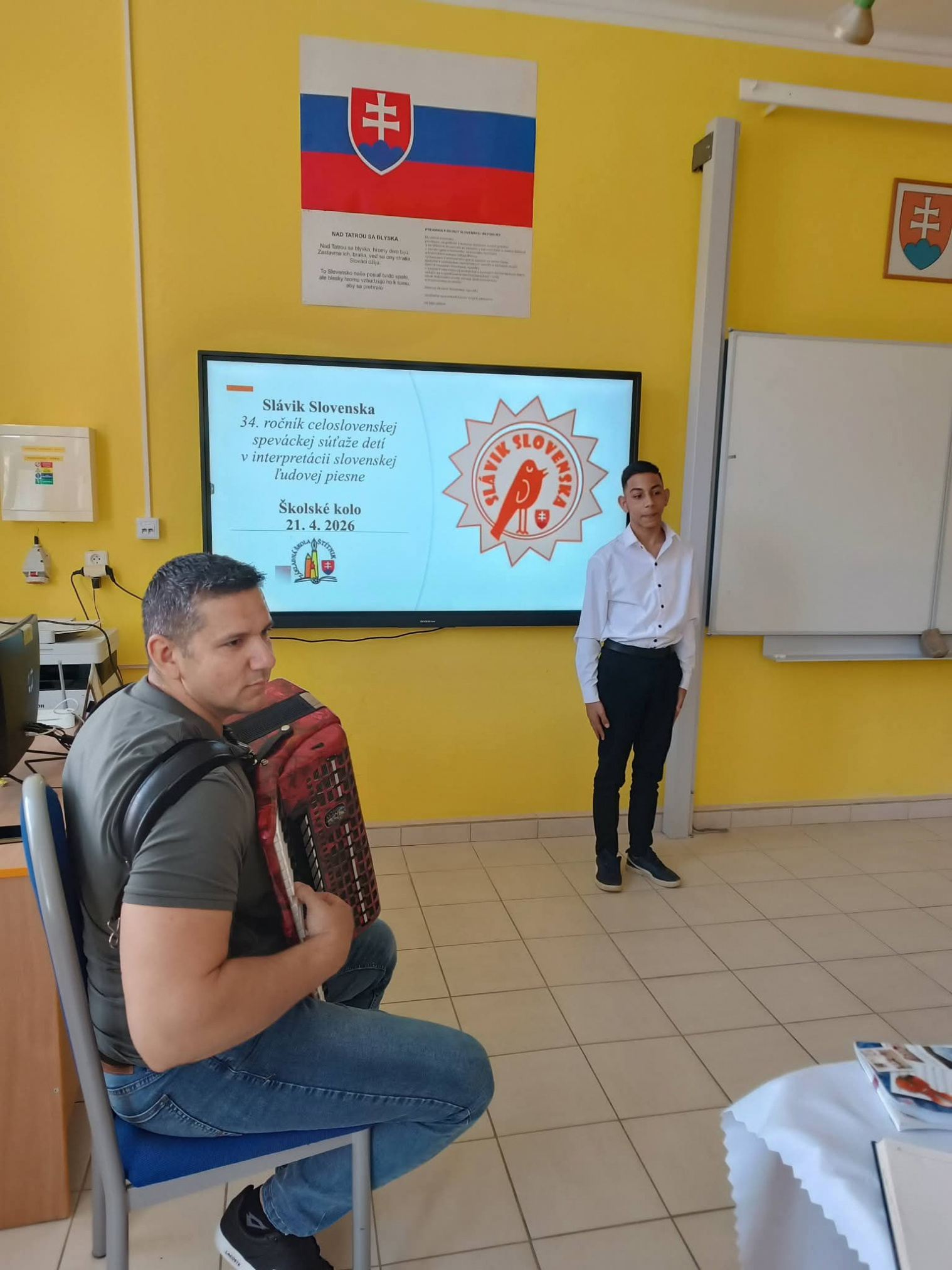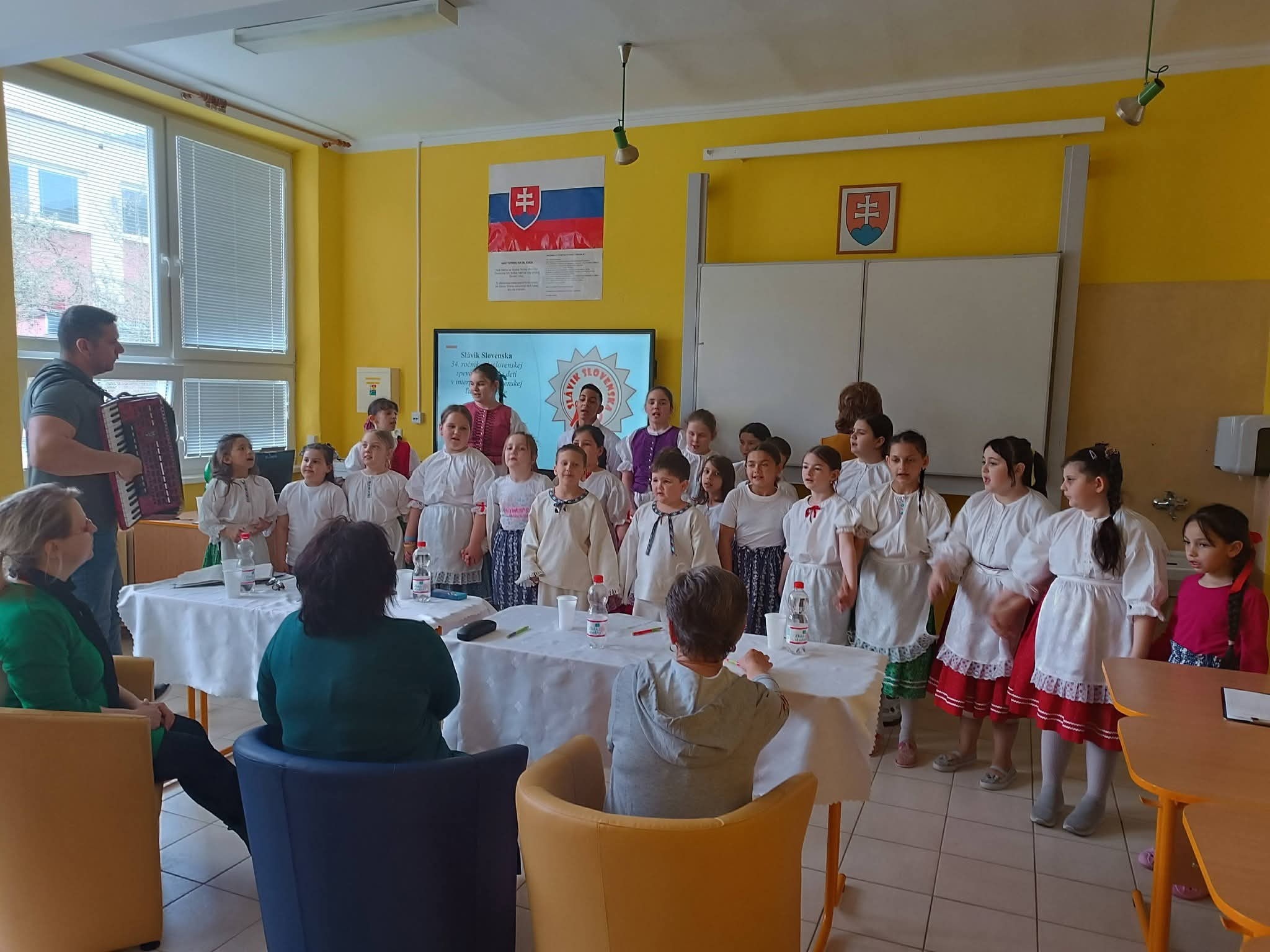 21.4.2026 sa naši žiaci zmenili na mladých slávikov a rozozvučali učebňu folklórnymi tónmi v školskom kole speváckej súťaže Slávik Slovenska. V porote sme mali vzácnu návštevu, bývalú pani riaditeľku Jarmilu Motúzovú. Na harmonike žiakov hudobne sprevádzal Ivan Hlaváč. Na každého žiaka čakala sladká odmena.